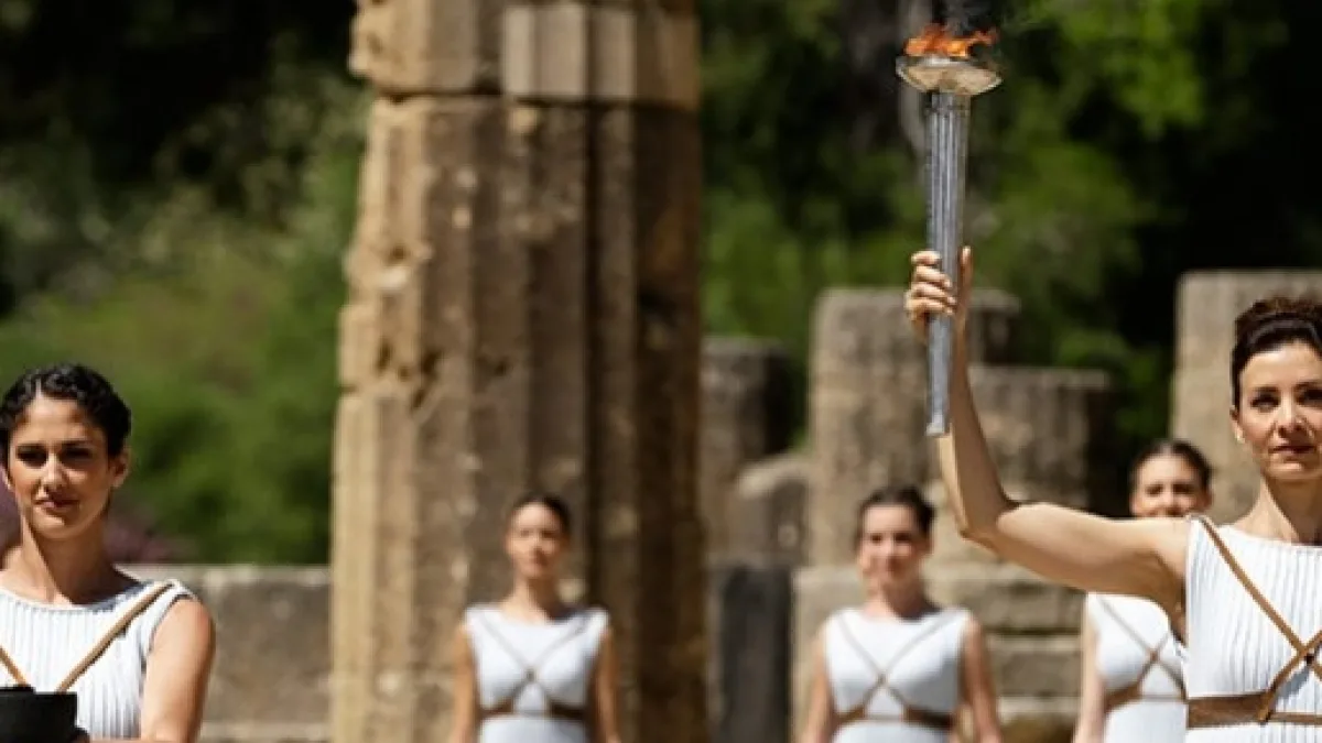 Una actriz vestida como sacerdotisa, enfocaba los rayos del sol en su antorcha metálica durante el encendido de la llama que será conservada como repuesto en caso de que las condiciones meteorológicas no acompañen en la ceremonia oficial teniendo en cuenta que el fuego olímpico se encenderá mediante un espejo parabólico que desviará los rayos solares hacia la antorcha, en una invocación al dios Apolo.
