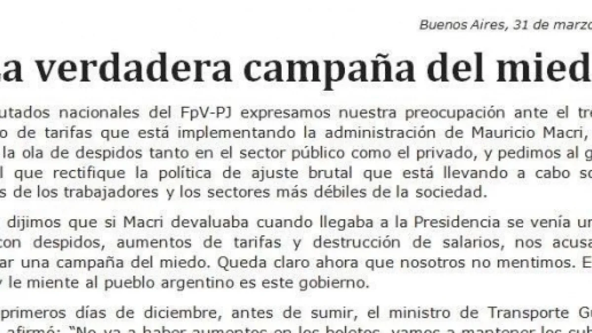 El opositor Frente para la Victoria, a través de la cuenta de twitter de su bloque de diputados, difundió un comunicado en que califica las nuevas tarifas como "un saqueo".